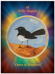 Willy Wagtail asks you to consider whether you have what it takes to turn your life around? “It is not hard,” he says. “By pulling me from the pack it would seem that you do have what it takes! I present myself to those who wish to leave the shackles of unconscious actions, patterns and thoughts behind, to dance freely in happiness as I do.”